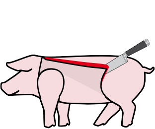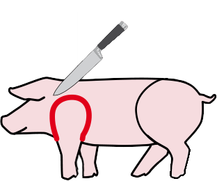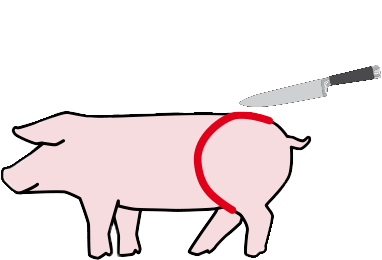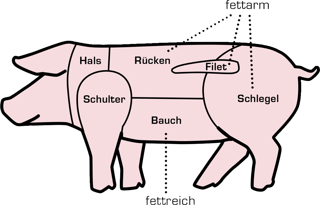 Fettarmes Fleisch von der Schinkenkeule und Schulter, zartes Fleisch vom Rücken und Nacken , fettreiches Bauchfleisch.